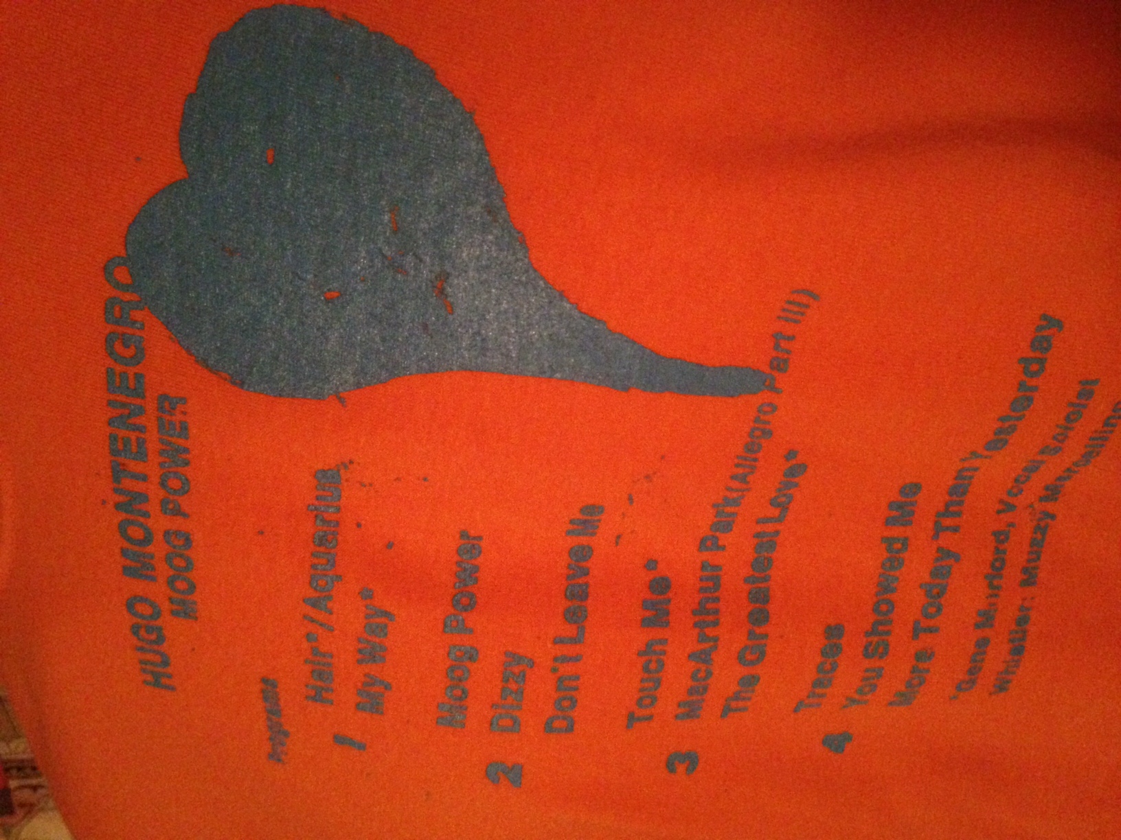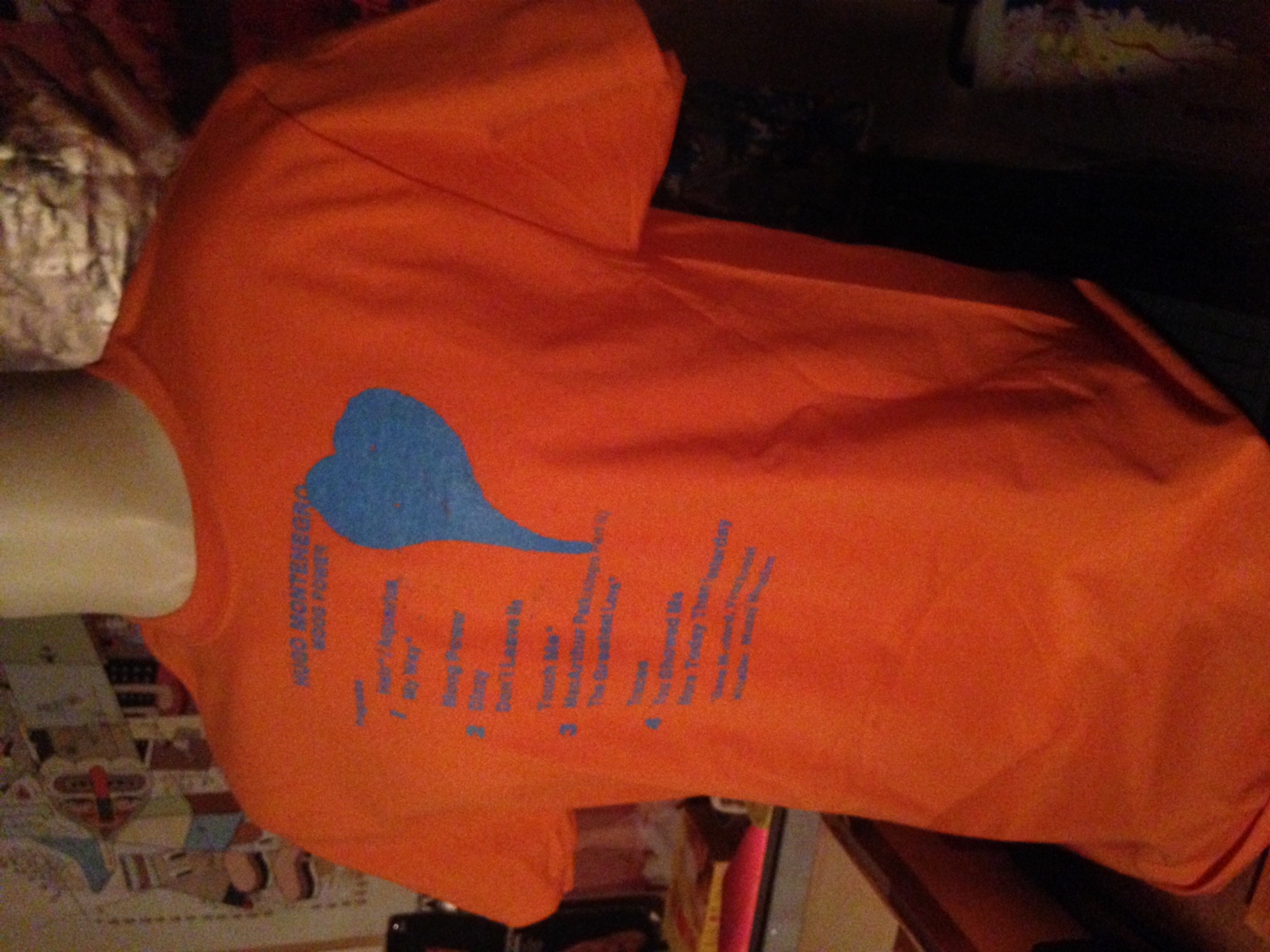 This is a track listing from an 8 track tape, includes a heart, printed in light blue ink on a 100% cotton tangerine shirt.