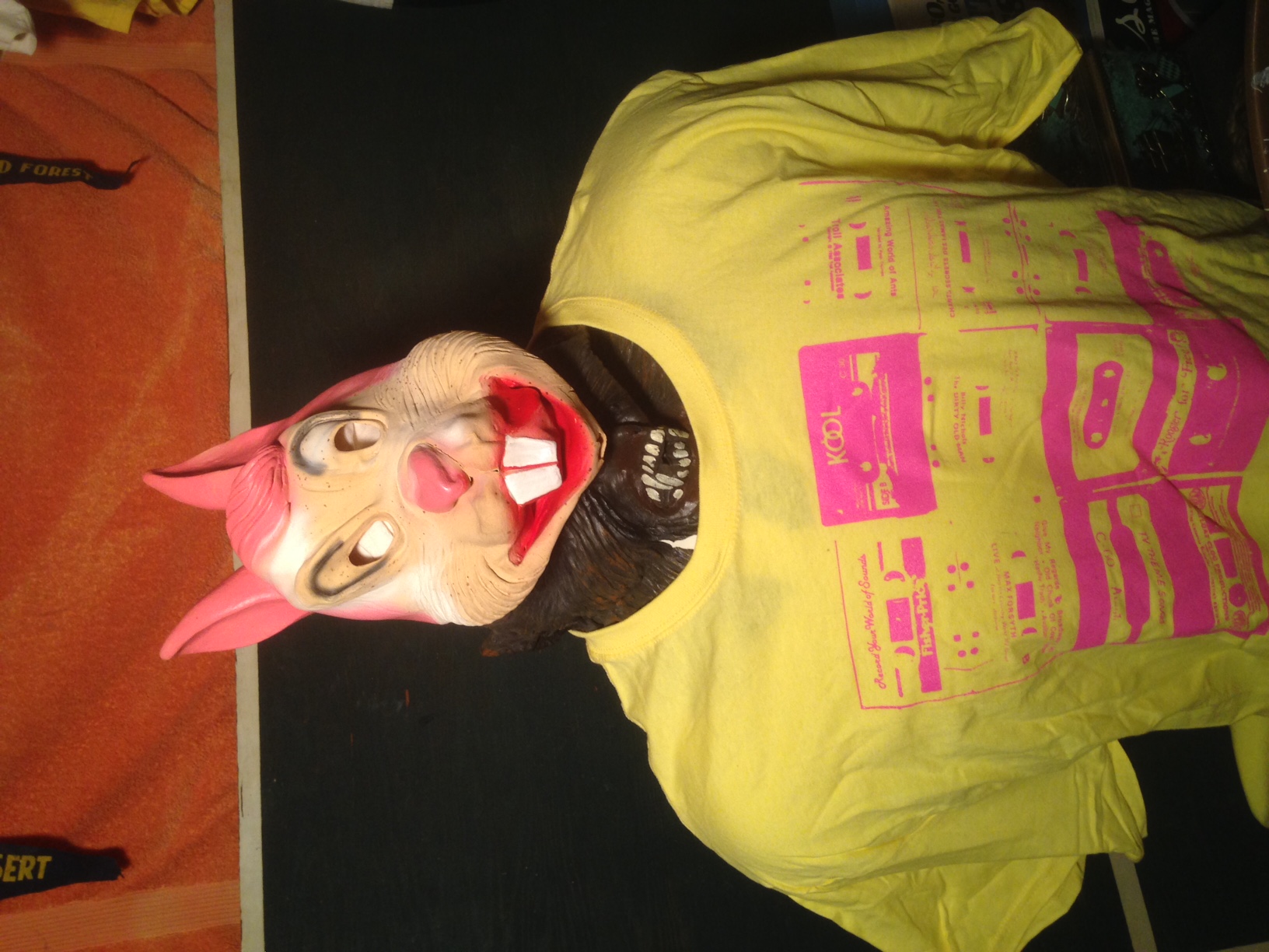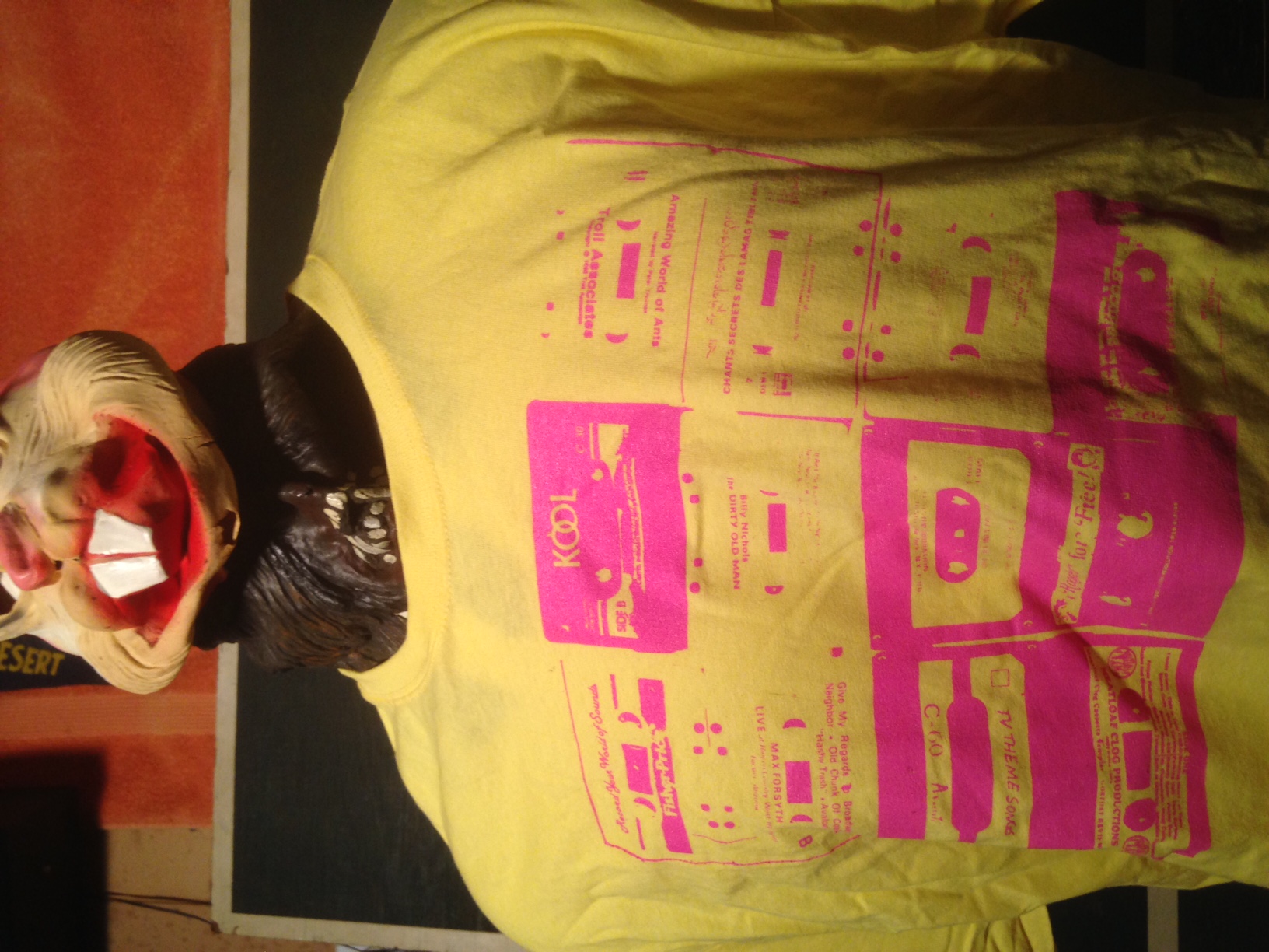 This image is a selection of my cassette collection, as seen on the covers of my Tapes Measure zine, printed in pink ink on yellow shirts.
