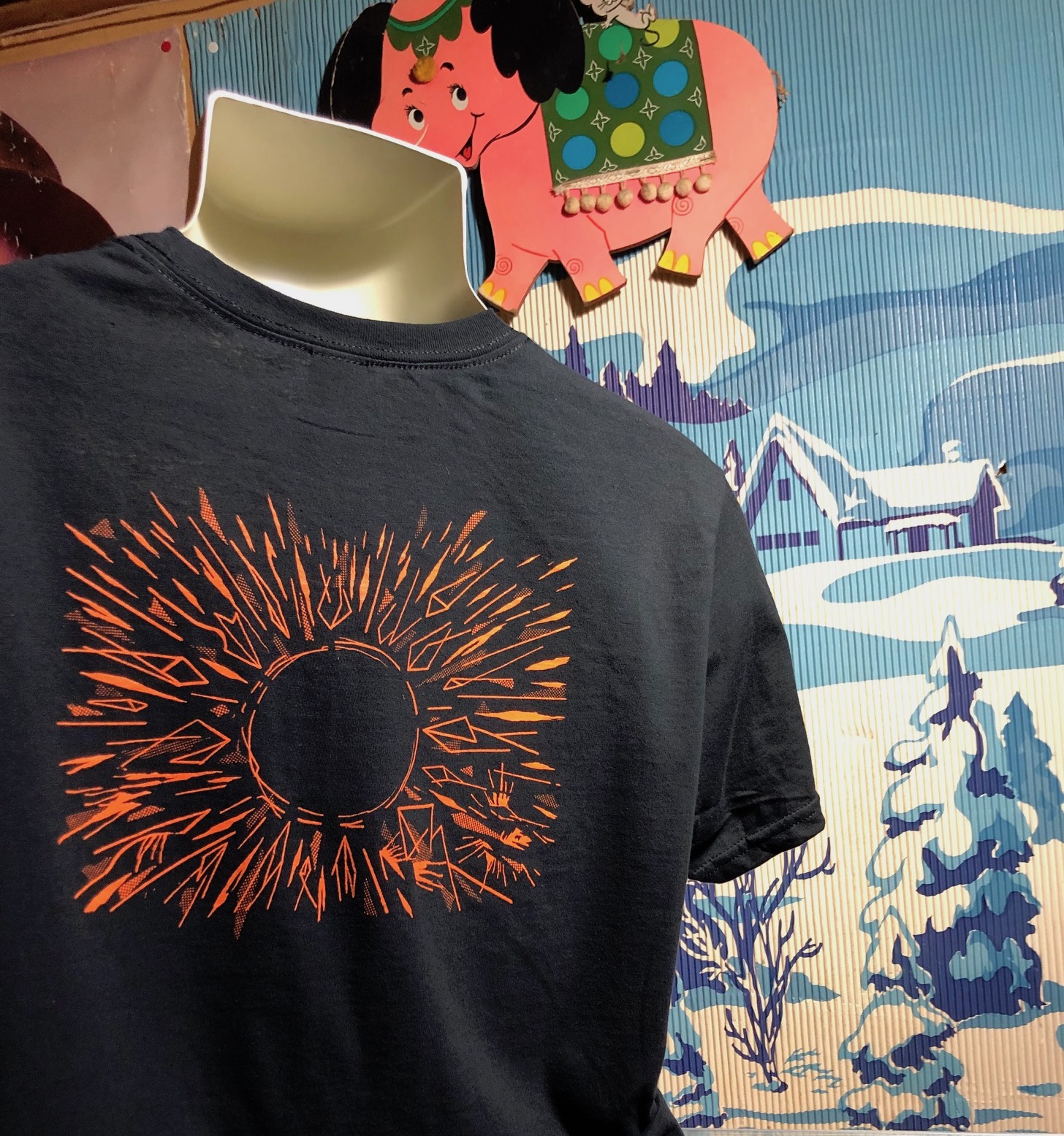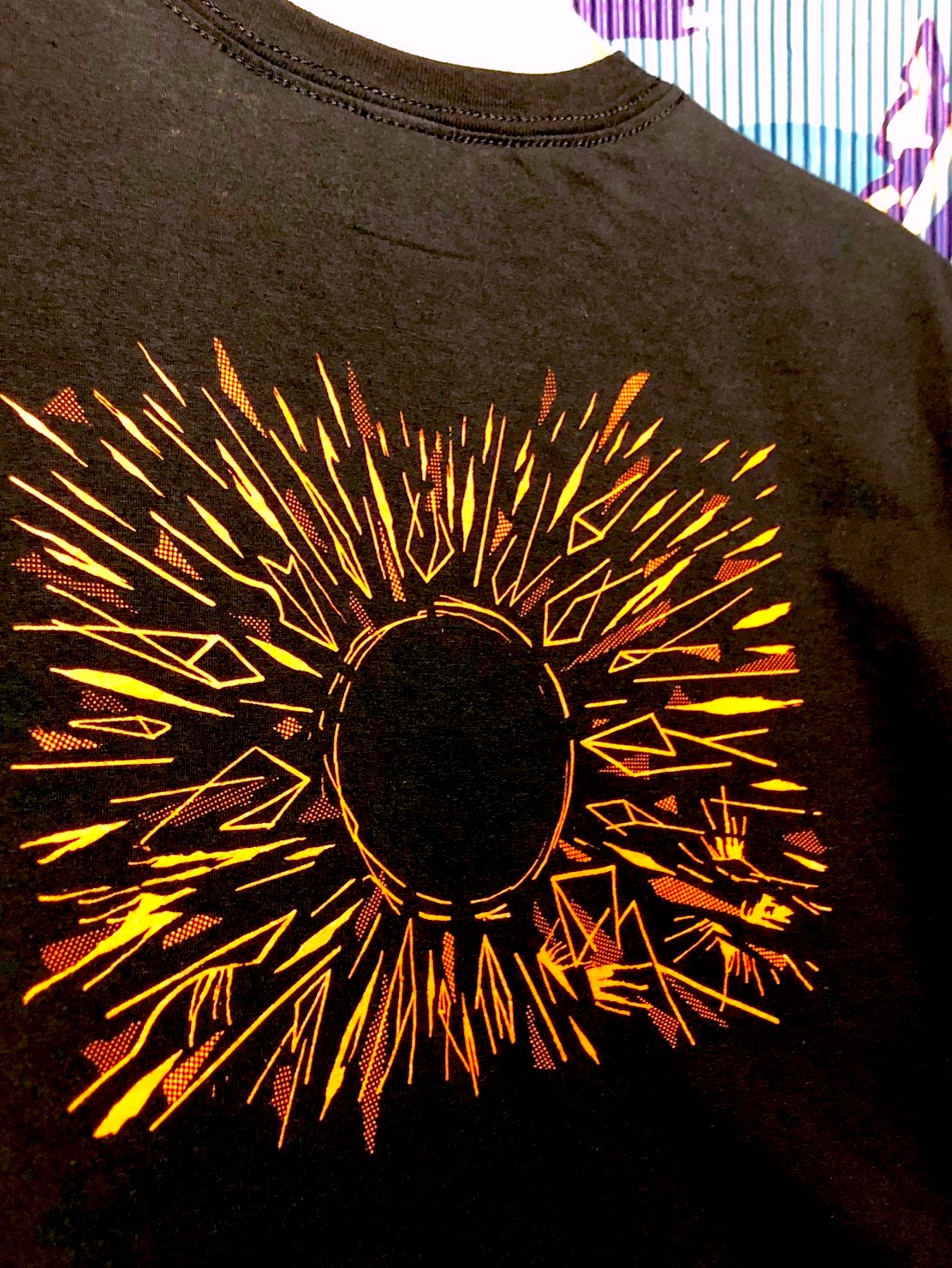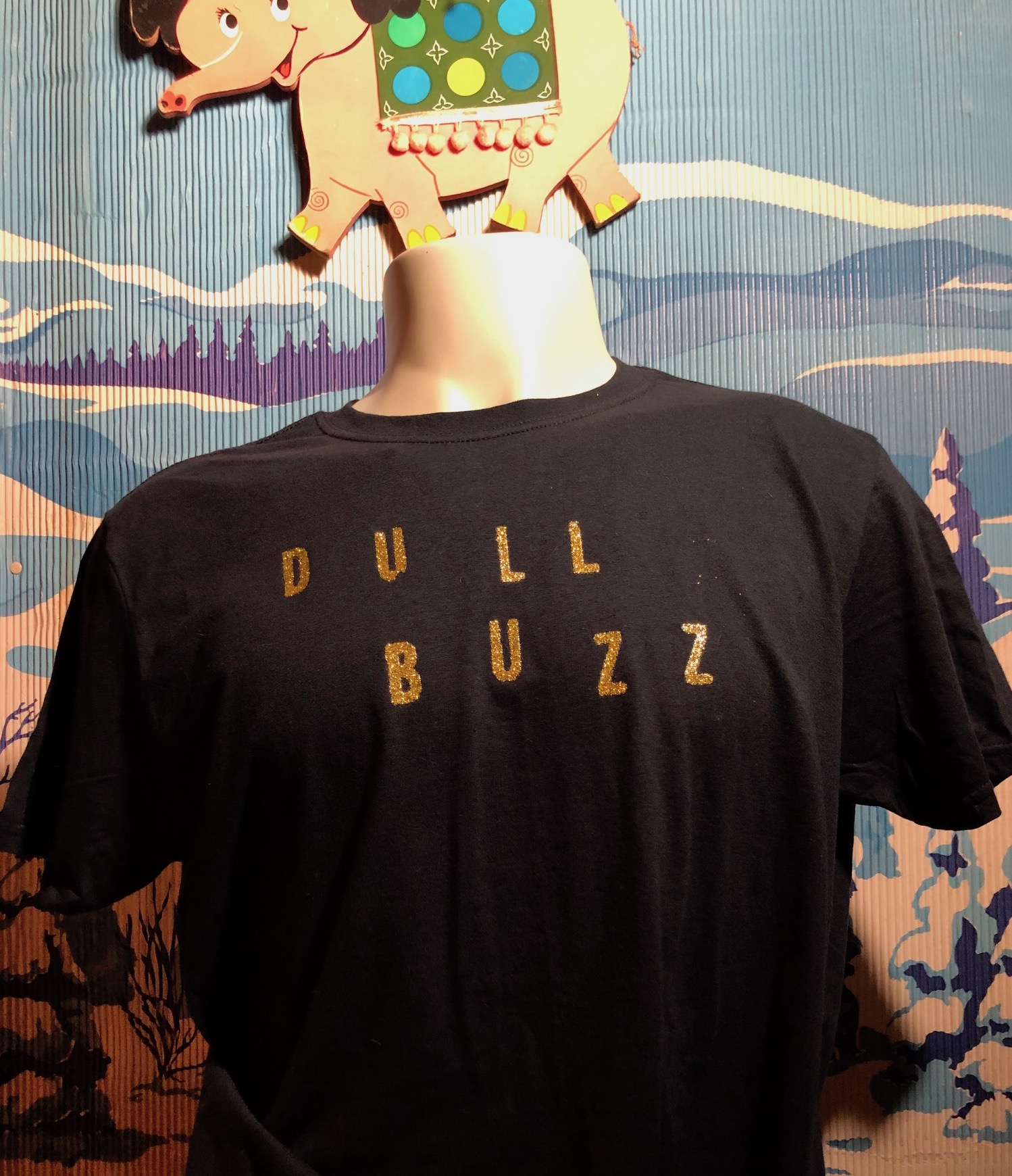 This is a promotional T shirt for my new Fantagraphics Underground book; it says DULL BUZZ in gold glitter lettering on the front, with an orange solar event drawing printed on the back of a black T shirt. These are hand screen printed shirts.
