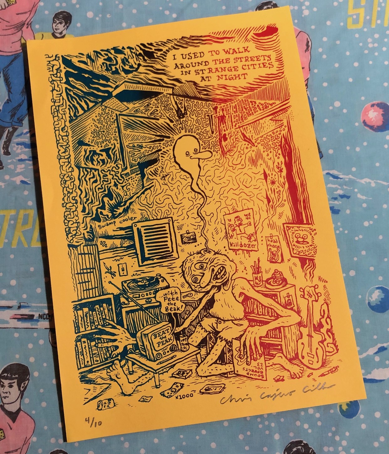 This is a two color, hand pulled screen print on cardstock. It is a signed, numbered edition of 10. 5 are printed on white, 5 on yellow, both are a split fountain of blue and red ink. Please specify white or yellow if you have a preference, otherwise I'll send you the next one in the stack numerically.